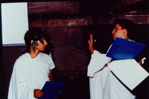 Ucenici I. gimnazije iz Splita i Klasicne gimnazije iz Zagreba na zavrsnoj priredbi "Mladi i hvarske starine" izvode odlomak Horacijeve satire "Nametljivi brbljavac".